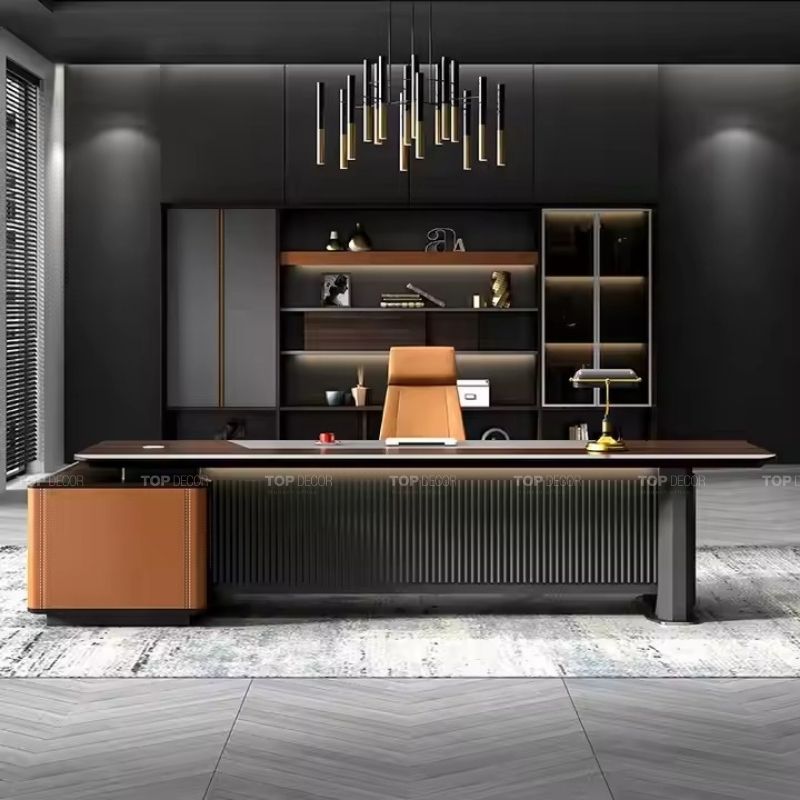 Bàn lãnh đạo được thiết kế dành riêng cho các vị trí cao nhất như chủ tịch hoặc tổng giám đốc, thường có kích thước lớn và kiểu dáng bề thế. Chất liệu cao cấp như gỗ óc chó, veneer gỗ tự nhiên được sử dụng để tôn lên vẻ sang trọng và quyền uy tối cao. Đây không chỉ là nơi làm việc mà còn là biểu tượng của sự thành công, khẳng định vị thế của người đứng đầu trong tổ chức.